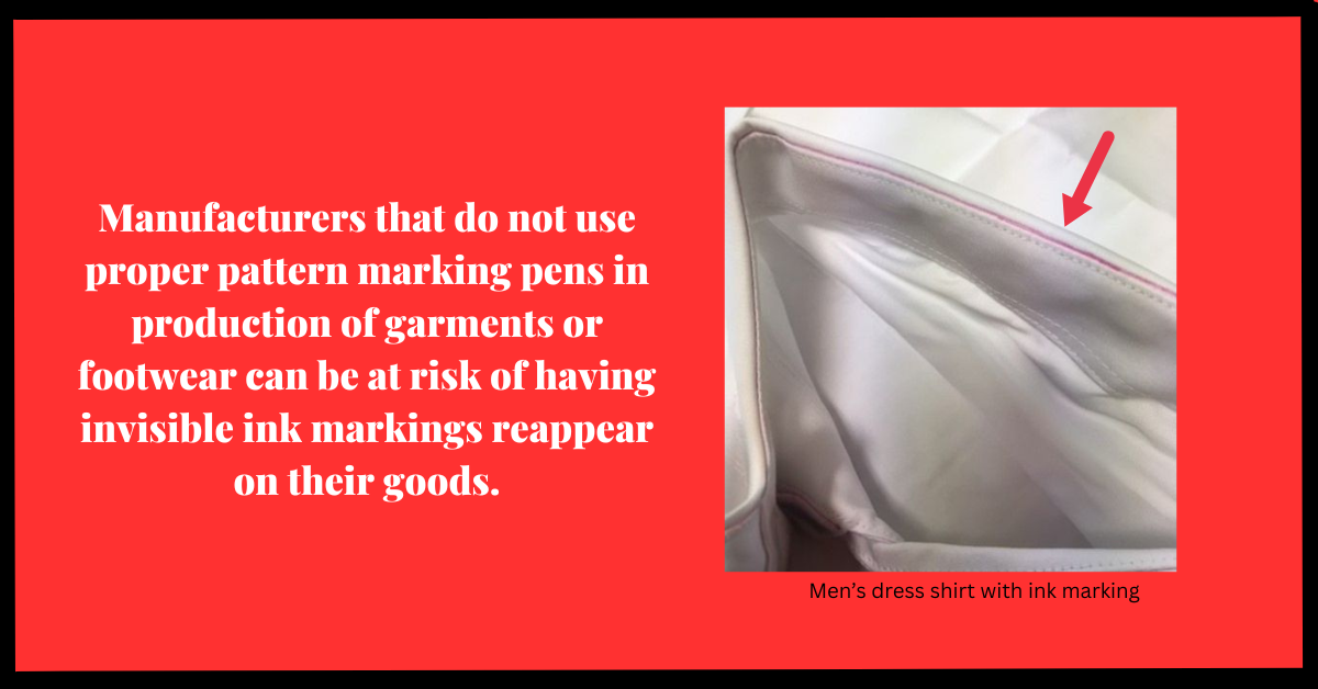 Retailers across the country are seeing these marks “magically” return on their supposedly floor-ready inventory, typically in the Fall or Winter. These marks are caused by the use of temperature-sensitive, or thermal sensitive marking pens when used in the manufacturing process. Manufacturers may use invisible ink to mark the places where seams, pockets, logos, buttons, etc., should be added to the garment or shoe. The invisible markings work well for streamlining the manufacturing process, which depending on the product involves heat at some point and the marks “disappear”. Manufacturers that do not use proper pattern marking pens in production for garments or footwear can be at risk of having invisible ink markings reappear on their goods.